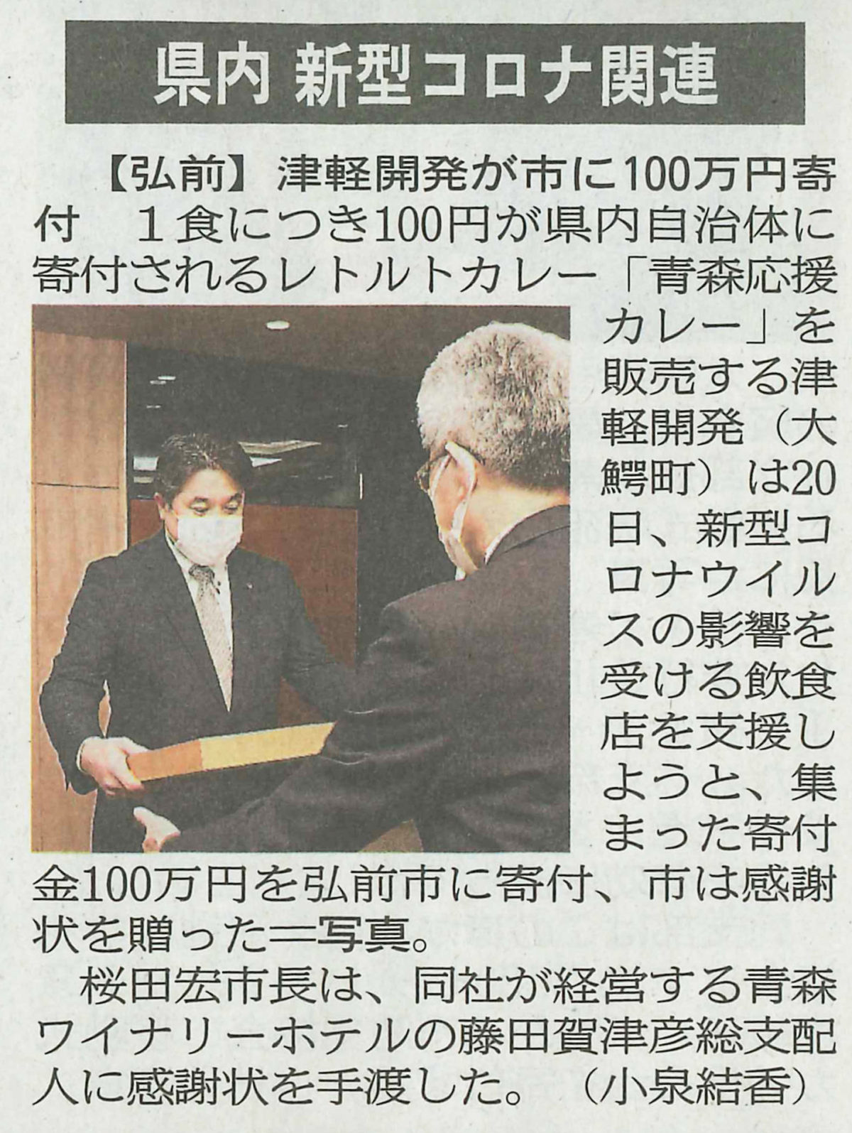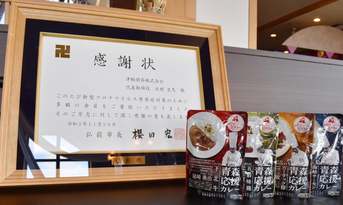 先日、「青森応援カレー」の売上の一部を弘前市へ寄付させていただきました。